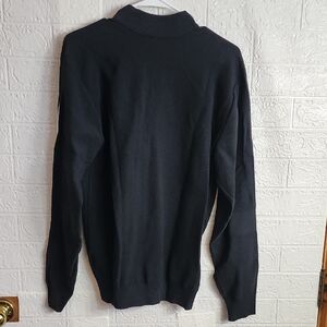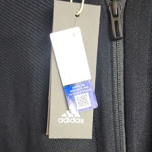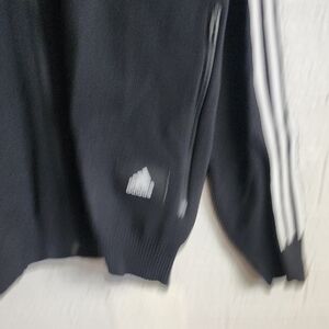 Stylish black jacket with vibrant logo. Features iconic white stripes on sleeves. Ideal for everyday wear.
