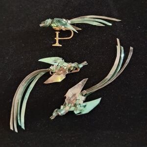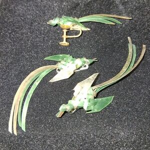 This set comes with only 1 earring. The broochs have a small safety pin on the back instead of the traditional pin clasp. Elegant bird-shaped brooch set in green and silver tones. Perfect for adding a unique touch to any outfit. This is a rare vintage set.