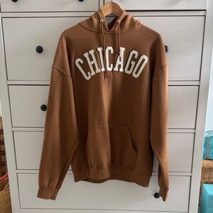 Cozy brown hoodie with 'CHICAGO' text. Gently used by me, bought new at a store in Chicago, kangaroo pocket.