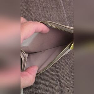 Preloved Fossil credit card wallet in cream calf leather. It is in great used condition with one stain on the ID window. Comes with a key fob to carry your keys. Features a secure zip closure and subtle branding. Please review each picture for details and condition of the wallet. It looks gray in the picture but it is color beige. Lighting may vary and may change color of wallet in pictures.