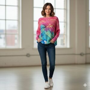 Brighten your wardrobe with this vibrant crew neck sweater. Featuring a stunning blend of pink, blue, and green, this sweater is perfect for adding a pop of color to any outfit. No brand tag or size tag. Length 22" Ptp 25" Sleeves 23"
