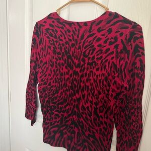 Stylish cardigan with striking red and black animal print. Features a button-up front.