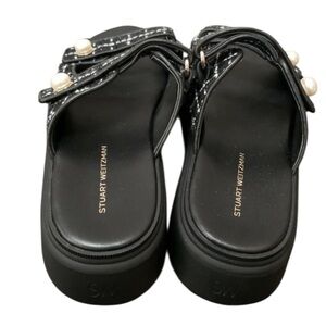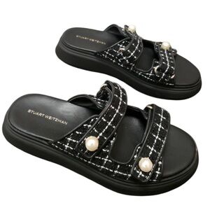 Stuart Weitzman Goldie Sports Slide Black and White Tweed with Pearl Details