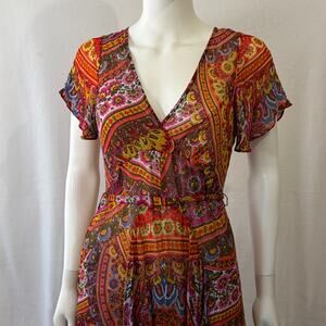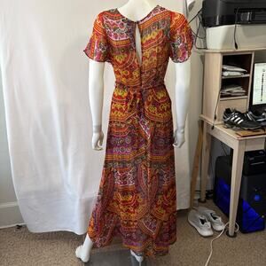 Anthropologie Akemi + Kin Boho Murol Maxi Dress size 6, Short sleeve, Lined to the thigh, zips up the back, lightweight with flowy. Excellent condition. 100% rayon.