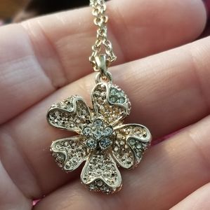 Lovely vintage flower necklace with sparkly clear rhinestones in pale gold tone metal.