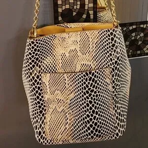 Stylish snake print pattern. Features black and cream tones. Elegant gold chain strap. Ideal for any occasion.