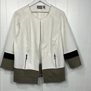 Chico’s Womens Open Front Jacket 2 (L) Tan Cream Black Color Block Zip Front Pockets Poly/Rayon Seam Detailing on Back Ponte EUC