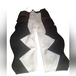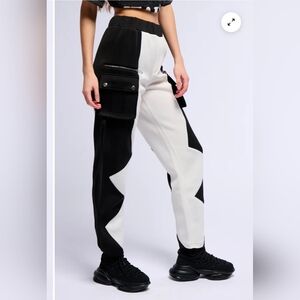 Prepare to get the party started at your next event in The AKIRA Label Pop The Bubbly Wavy Statement Jogger. These stretchy scuba knit bottoms feature jagged colorblock paneling, a cinched elastic waistband, a high rise design, faux silver metallic hardware, mock zipper pockets, and functional snap button cargo thigh pockets. Complete with structured, dramatic waves on the outer legs, tapered ankle hems, and a pull-on fit. Pair with fitted tops and peep toe stiletto booties for a fierce finish.