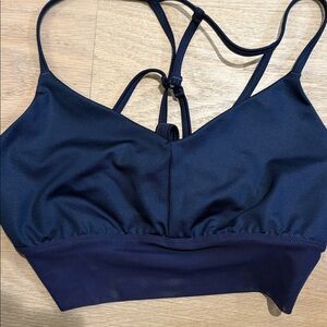 Sleek black sports bra with stylish strappy back. Ideal for workouts.