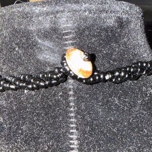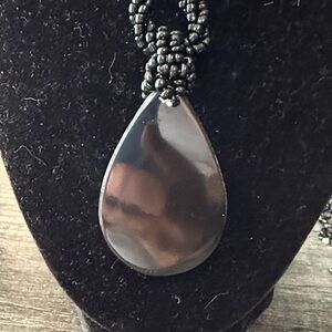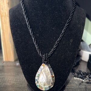 This stunning necklace features a teardrop pendant with a beautiful abalone shell design, complemented by a black braided chain. Perfect for adding a touch of elegance to any outfit.