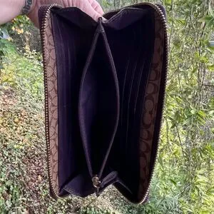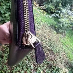 Keywords: Coach wallet, women's wallet, purple wallet, zip-around wallet, crossgrain leather, solid pattern, logo accent, credit card holder, pre-owned wallet, fashion accessory.