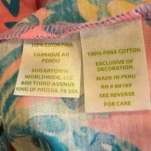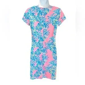 Lilly Pulitzer Brewster short sleeve Pima cotton Pelican Pink dress. 100% Pima cotton made in Peru. Notched V-neck. Short sleeve. White embroidered detail on front chest. Lightweight. Gorgeous bright pink and blue pineapple pattern. Excellent condition with no noted flaws. This dress is perfect for your beach vacation. Women’s size small. Measures approximately 16 inches flat across chest from armpit to armpit and 35 inches in length.