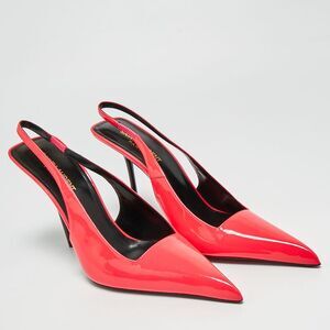 These Saint Laurent Kiss slingback pumps are crafted from neon pink patent leather offering a bold glossy finish. Designed with an open back and sling strap they present a streamlined profile suited for statement styling. The pointed shape adds definition while maintaining a refined silhouette.