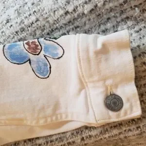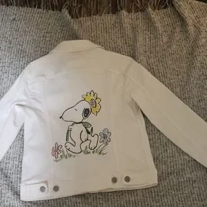 Adorable Levi's denim jean jacket with Snoopy and flower hand painted design. Special fabric paint is used and heat sealed for permanency. Machine washable.Perfect for a playful look. Measurements are approximately: pit to pit 16", length: 20" Size Small Custom piece. Unique piece painted on an iconic jacket. 🎨 Wearable art. Not included in 1/2 off bundle offer.