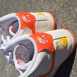 Vibrant Nike sneakers with a bold orange swoosh. High-top design for extra support. Ideal for active kids.
