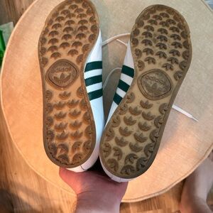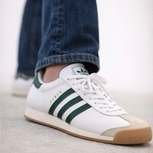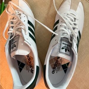 Classic Adidas sneakers with a sleek white and dark green design. Comfortable and stylish for any occasion.