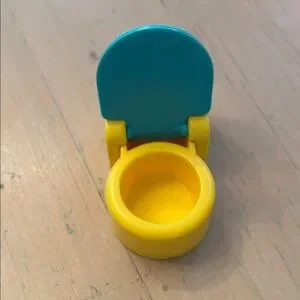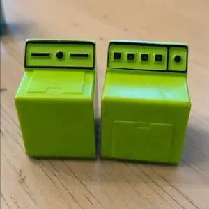 This vintage Fisher Price play set includes a bath tub, sink, scale, toilet, sewing machine, and washer & dryer