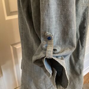 Stylish light blue denim shirt with button-up front. Features two chest pockets and roll-up sleeves. Size large, Preowned, clean and smoke free home.