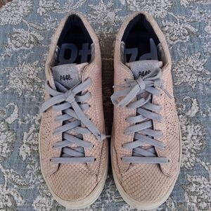 Stylish P448 John Prince Pink Python-Printed Leather Low Top Sneakers Sz. 38/7.5 with grey laces. They have a lightly padded tongue with a soft terry loop interior lining and a removable memory foam footbed. They have a strategically distressed sole for a pre-worn look and feature the brand's signature perforated logo on the side. These are in very good PRE-LOVED condition with minor signs of wear. Wear includes minor dirt on the bottom soles.