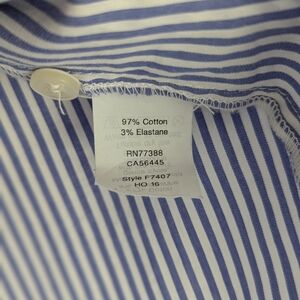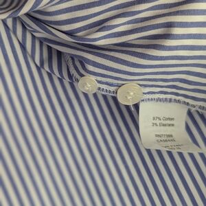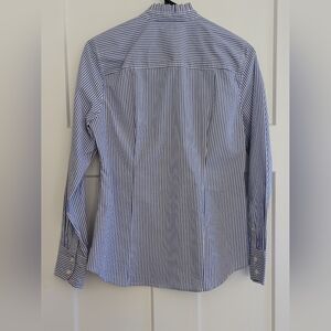 Ladies long sleeved Blue and White striped button up blouse with ruffle collar and ruffle down the front.