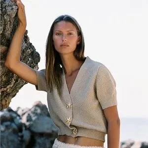 Zara Star Button Knit Women’s Cardigan Short Sleeve Tan Beige Size Medium