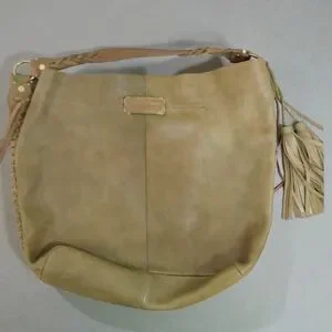 Isabella Fiore green leather hobo bag. Features intricate laser-cut geometric diamond shape patterns along the front and sides with decorative hand stitching. Braided leather shoulder straps add a bohemian flair. Two decorative leather tassels hang from one strap. Interior features one zip compartment. Very roomy! The color variations in the leather are intended by design, but there are some scratches not that noticeable. Also, note green spot near hardware- pics attached.
