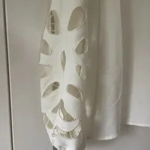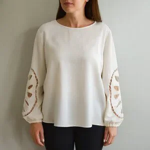 An elegant cream crewneck blouse with unique cutout sleeves. This top offers a sophisticated silhouette with its flowing body and subtly blouson sleeves, finished with elasticized cuffs for a comfortable fit. The intricate cutout detailing on the sleeves adds a touch of artisanal charm and a hint of allure, making it a standout piece. Perfect for a chic dinner date or an elevated daytime event.