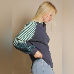 Floral Stripe Balloon Sleeve Knit Top Blue Green
