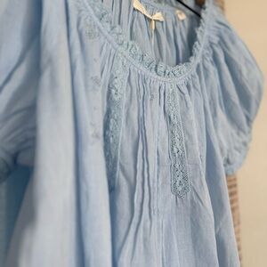 Doen Frederica Top in Icy Blue, size S. NWT. Short sleeve breezy top in organic cotton voile. Slightly sheer, floral embroidered detail, and scallop trim on scoop neckline and sleeves. Tried on but never worn, excellent condition.