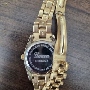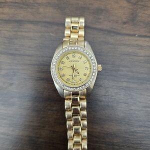 No scratches on crystal or on watch band. Brand is Geneva and it's gold toned stainless steel with white crystals surrounding the watch face on inside at each number. Three arms for time. Adjustable band. Sold As Is. I think it will work with a new battery but I'm not going to change it to check.