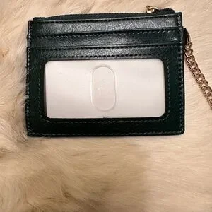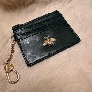 Stylish green card holder featuring a gold bee accent. Includes a gold chain and clasp.