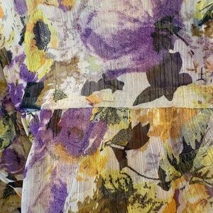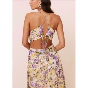 Drop jaws at your next wedding or event with this feminine and sexy backless design! Vibrant yellow and purple floral pattern. Perfect for any upcoming summer events. Only worn once!