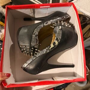 Bold black heels with striking snake print. Features edgy spikes for a daring look. Perfect for a night out.