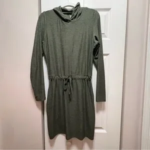 Olive hooded dress with pincher pockets. Drawstring waist. Ideal for everyday wear. Please see photo for a small pull on sleeve - a sweater shaver should fix this spot.
