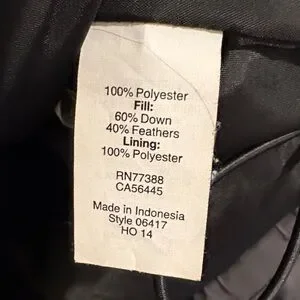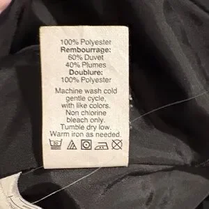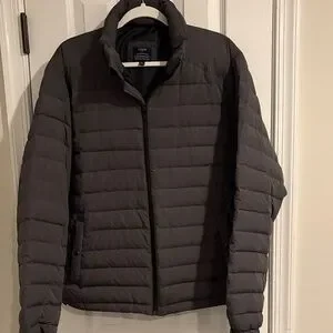 Sleek and warm puffer men’s jacket with down filling. Machine washable. Ideal for cold weather. 28” from shoulder to hem. Rarely worn, kept in a pet-free and smoke-free home. Men’s size large. 2 side snap pockets and 1 interior zip pocket.