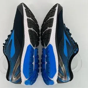 Men’s Brooks Ghost 10 running shoes in black with bold blue accents. Designed for neutral runners needing smooth cushioning and dependable support.