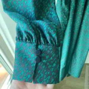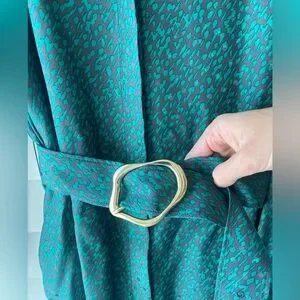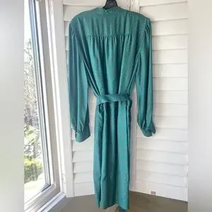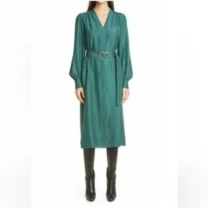 Chic wintergreen 100% silk dress with long sleeves that have beautiful button detailing. Features a stylish belt with gold detailing. Like new, no flaws, 100% authentic.