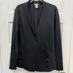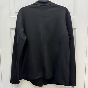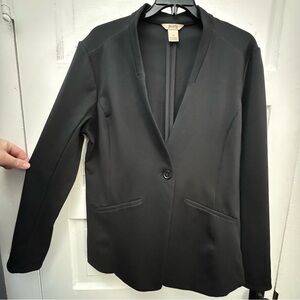 Structured workwear blazer jacket by Duluth Trading Co in women’s size 14, black. Single-button front closure with notched neckline and functional slit pockets. Clean, tailored silhouette suitable for professional and business casual wear.