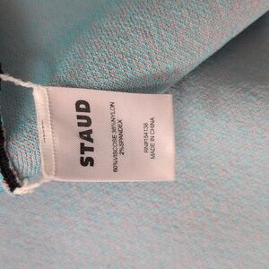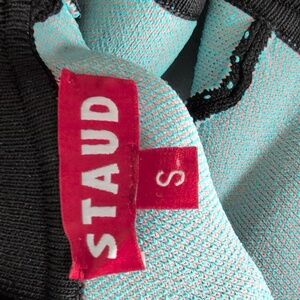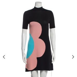 Elegant black with large mod flower in pink and blue by STAUD. Ideal for modern style. Reminiscing 1960's Twiggy, Jean Shrimpton's Mary Quant's designs. I searched high and low for this magnificent piece and found this in small. Please pay attention to the detailed measurements as this small is made small, think almost XS. I am a 4, but there is absolutely no extra room on me, and this is why I'm selling it. I Would GLADLY SWAP FOR A MEDIUM OR EVEN A LARGE if you have one. I would also take the green version.
