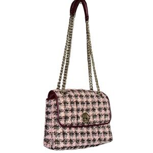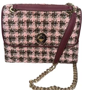 The Kate Spade Natalia Tweed Small Flap Crossbody bag features a pink multicolor tweed fabric, a gold-tone chain strap, and a twist-lock closure