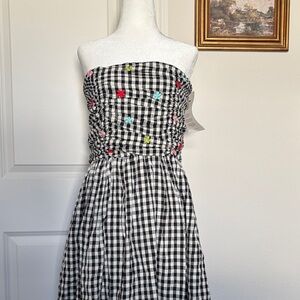 NWT Tach size XS ruched black and white gingham dress with multi colored embroidered flowers. Bodice is very stretchy could fit a small as well. Length is 43.5”