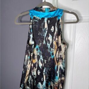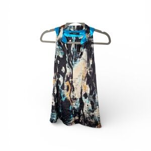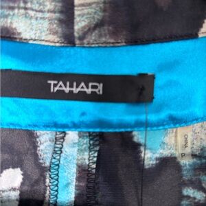 Elevate your professional and casual wardrobe with this stunning NWT Tahari sleeveless blouse. Featuring a sophisticated black and tan print highlighted by a pop of blue, this top offers a modern twist on classic career wear. The lightweight polyester-spandex blend ensures a comfortable fit with just the right amount of stretch.