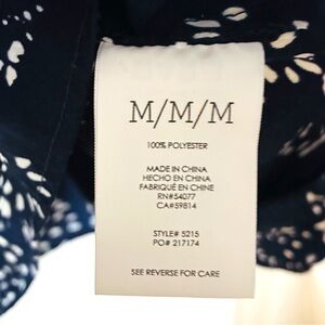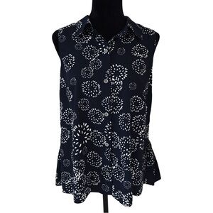 Chic navy blouse by Cabi with white accents that look like dandelions or fireworks (you decide!). Sleeveless and stylish with a cute peplum ruffle in the back. Ideal for casual wear.