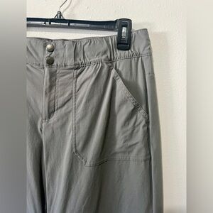 Columbia branded Women's convertible hiking pants/shorts in a silver-grey color, lightweight moisture-wicking/advanced repellency fabrication, high waisted, straight leg pant, zip-off feature to convert pants into bermuda length shorts, oversized front pockets with 2 zipper pockets in back, double button and zipper closure.