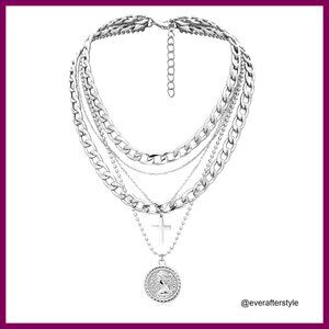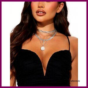 A 5-in-1 layered necklace set featuring a mix of chunky and dainty chains with a retro coin pendant. Designed for adjustable wear, this trendy set is perfect for creating a statement look for special occasions or as a thoughtful gift.