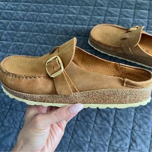Birkenstock Buckley Clog Shoes Women’s Size 8 Cognac Brown Oiled Leather Tan Suede