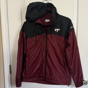 VT Burgundy and black design zippered jacket. Size S/P. Lightweight, durable & fleece lined jacket with drawstring hood and 2 zippered pockets. Bottom pull cord to tighten around waist as desired. Elastic wristbands. Ideal for outdoor activities. Purchased brand new and never worn.