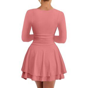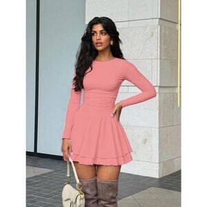 Women's Pink Crew Neck Corset Mini Dress Long Sleeve Ruffle Hem Party Club Wear