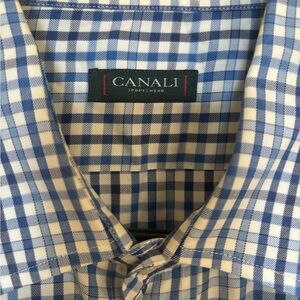 Elegant plaid design with button-down style. Perfect for casual outings. Crafted by Canali for a refined look.