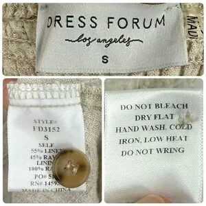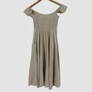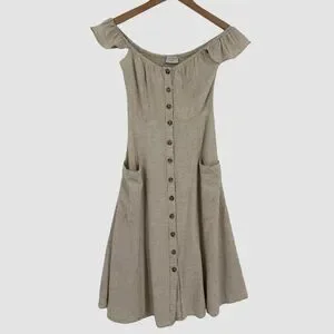 Effortlessly feminine and breezy, this Dress Forum Los Angeles off-shoulder midi dress is the perfect neutral piece for summer or fall layering. Features a button-down front, elastic ruffle neckline (wear it on or off the shoulders), and a smocked back bodice for a flattering, comfortable fit. The full A-line skirt includes deep side pockets—perfect for carrying essentials while maintaining a relaxed, boho-chic silhouette. Linen-blend fabric with a natural texture gives this dress a timeless, coastal-cottage feel. Excellent pre-owned condition. No visible flaws.